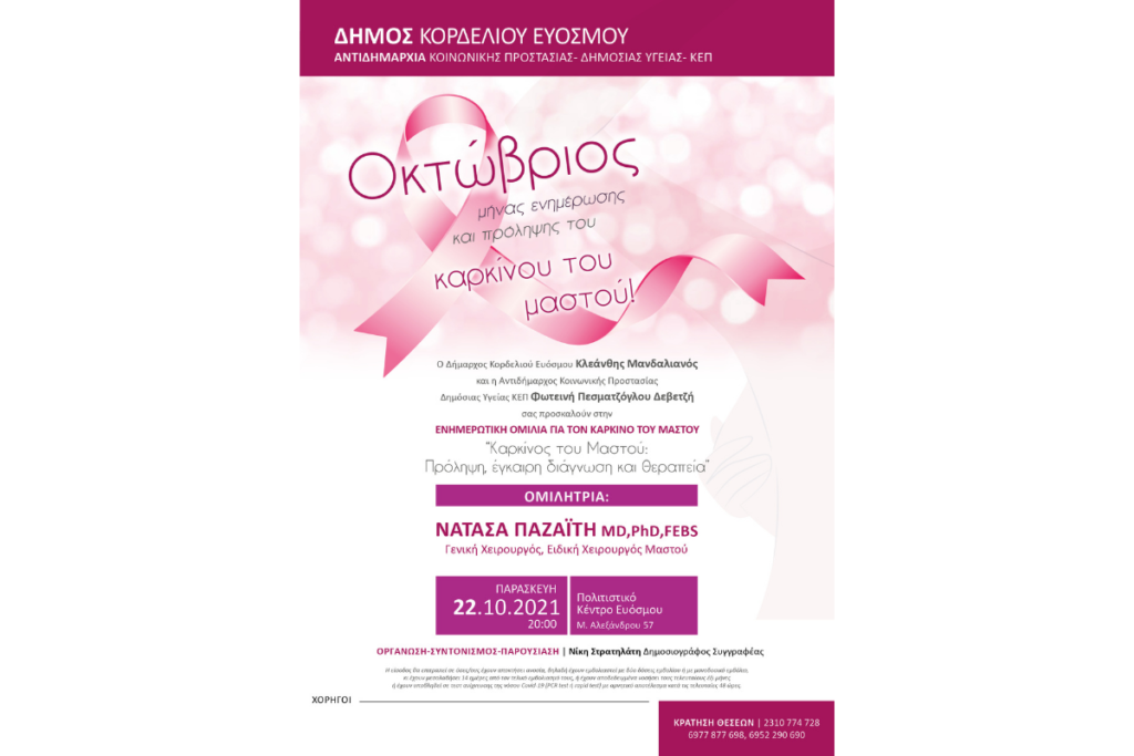 Ο “Καρκίνος του Μαστού: Πρόληψη, έγκαιρη διάγνωση και θεραπεία” είναι το θέμα που θα αναπτύξει η Γενική Χειρουργός – Ειδική Χειρουργός Μαστού κ. ΝΑΤΑΣΑ ΠΑΖΑΙΤΗ MD, PhD, FEBS, την Παρασκευή 22 Οκτωβρίου 2021 στις 20.00, στο Πολιτιστικό Κέντρο Ευόσμου Μ. Αλεξάνδρου 57