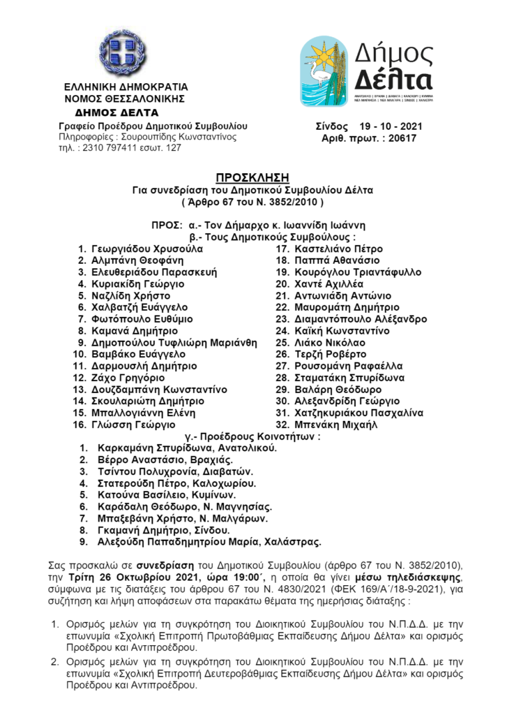 Συνεδρίαση του Δημοτικού Συμβουλίου (άρθρο 67 του Ν. 3852/2010), την Τρίτη 26 Οκτωβρίου 2021, ώρα 19:00΄, η οποία θα γίνει μέσω τηλεδιάσκεψης, σύμφωνα με τις διατάξεις του άρθρου 67 του Ν. 4830/2021 (ΦΕΚ 169/Α΄/18-9-2021)