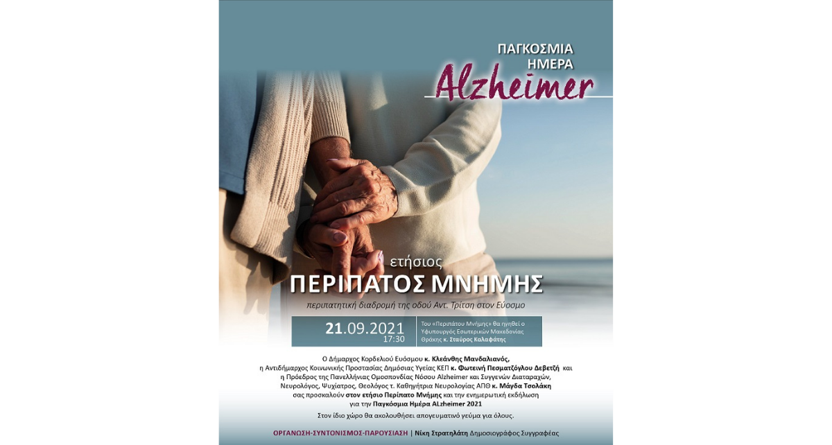 συνδιοργανώνουν αύριο Τρίτη 21 Σεπτεμβρίου στις 5.30μμ την Παγκόσμια Ημέρα Alzheimer, μεταφέροντας για πρώτη φορά τον ετήσιο «Περίπατο Μνήμης» από το κέντρο της πόλης στον 2ο μεγαλύτερο Δήμο της Βορείου Ελλάδος – (με 1ο τον Δήμο Θεσσαλονίκης), στον Δήμο Κορδελιού Ευόσμου.