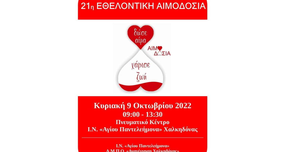 Την Κυριακή 9 Οκτωβρίου 2022, από τις 9:00 – 13:30 θα πραγματοποιηθεί η 21η Εθελοντική Αιμοδοσία στο Πνευματικό Κέντρο Ι.Ν. Αγίου Παντελεήμονα, Χαλκηδόνας.