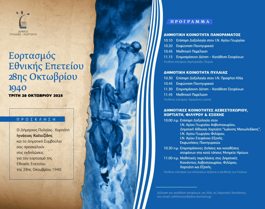 Με λαμπρότητα και σεβασμό, ο Δήμος Πυλαίας – Χορτιάτη τιμά φέτος την εθνική επέτειο της 28ης Οκτωβρίου 1940, σε ανάμνηση του ηρωικού αγώνα των Ελλήνων κατά των δυνάμεων του φασιστικού – ναζιστικού Άξονα, καθώς και την επέτειο της απελευθέρωσης της Θεσσαλονίκης το 1912.
