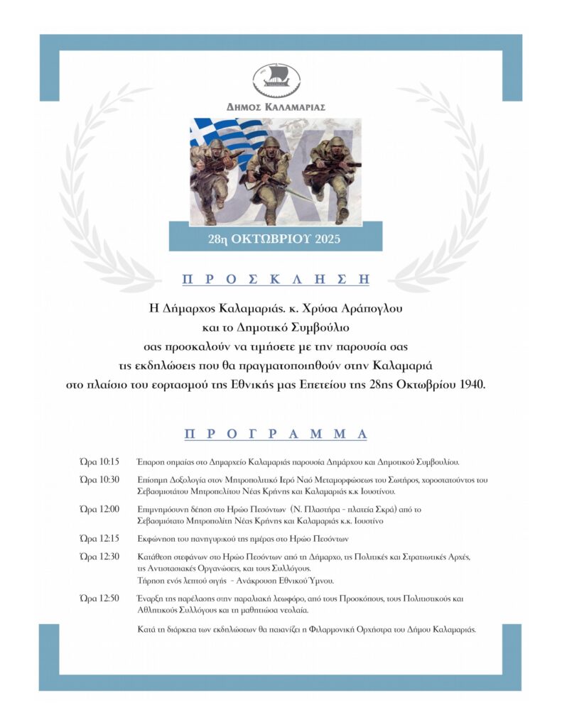 Η Καλαμαριά ετοιμάζεται να τιμήσει με λαμπρότητα την Εθνική Επέτειο της 28ης Οκτωβρίου 1940. Ο Δήμος και οι τοπικοί φορείς προετοιμάζουν εκδηλώσεις, δοξολογίες και παρέλαση μαθητών και συλλόγων, τιμώντας τη μνήμη των πεσόντων και την ιστορική σημασία της ημέρας.