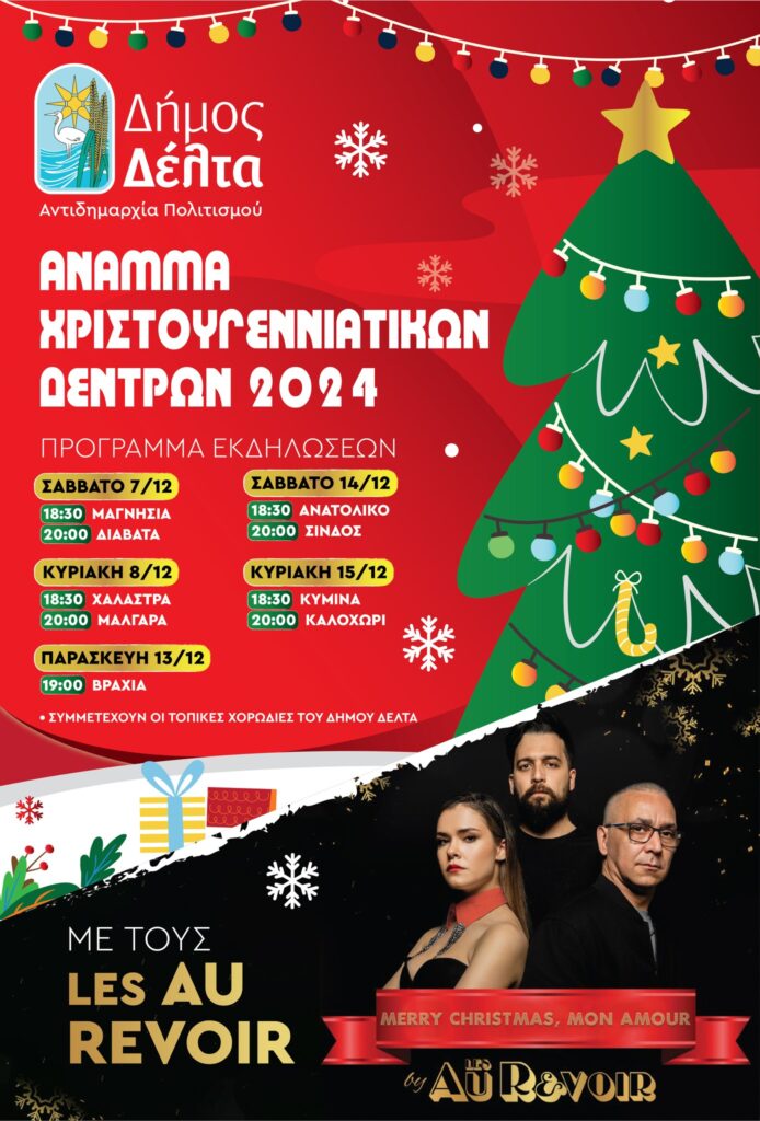 Σε όλες τις κοινότητες το παρών θα δώσουν οι χορωδίες του Δήμου Δέλτα ενώ το κλείσιμο σε κάθε κοινότητα θα κάνουν οι “Les Au Revoir” με τη συνοδεία ζεστού κρασιού για τους μεγάλους και εκπλήξεων(face painting, μπαλόνια κ.α.) για τους μικρότερους, τους οποίους θα “αναλάβει” ο Άγιος Βασίλης με βοηθούς δύο ξωτικά!