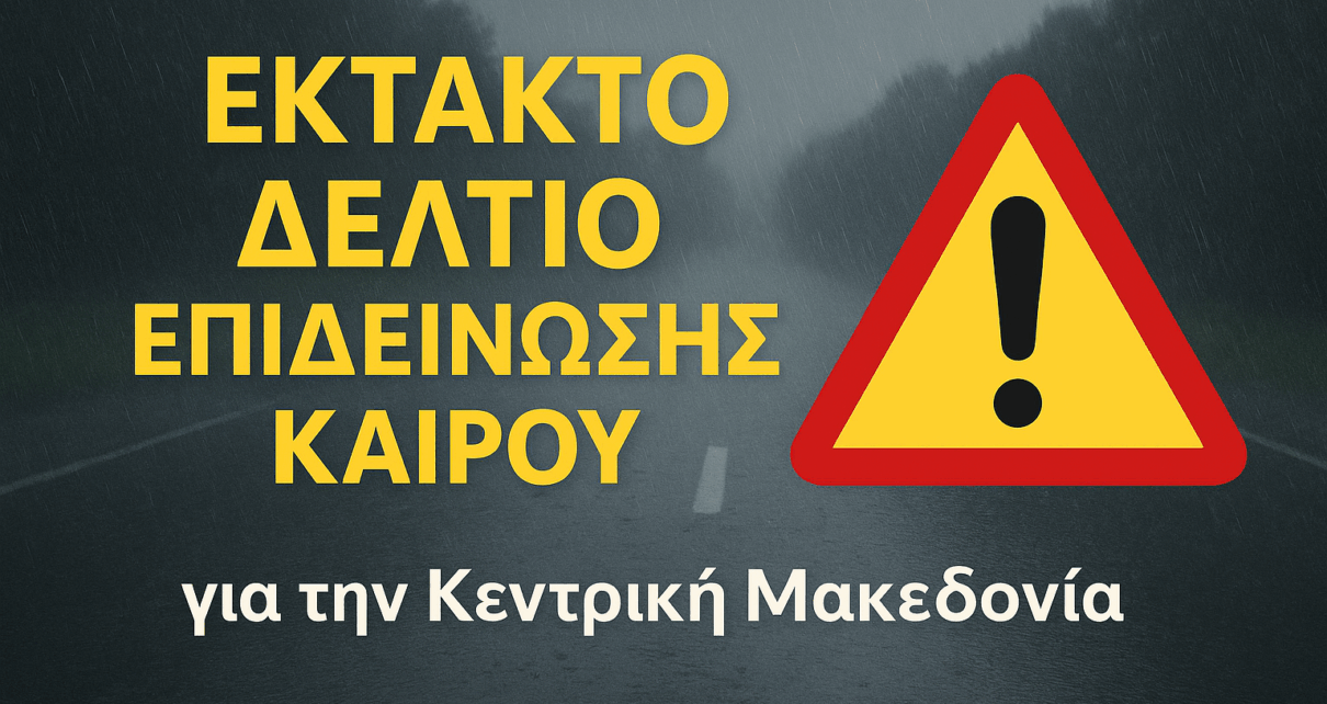 Η Αυτοτελής Διεύθυνση Πολιτικής Προστασίας της Περιφέρειας Κεντρικής Μακεδονίας ανακοίνωσε ότι τέθηκε σε ισχύ Έκτακτο Δελτίο Επικίνδυνων Καιρικών Φαινομένων από το Εθνικό Συντονιστικό Κέντρο Επιχειρήσεων και Διαχείρισης Κρίσεων (Ε.Σ.Κ.Ε.ΔΙ.Κ.) της Γενικής Γραμματείας Πολιτικής Προστασίας, με ισχύ από την Πέμπτη 2 Οκτωβρίου 2025.