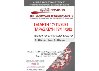Δωρεάν ελέγχους ταχείας ανίχνευσης αντιγόνου (rapid test) Covid-19 για πεζούς θα διενεργήσουν στο Ωραιόκαστρο κλιμάκια του ΕΟΔΥ, σε συνεργασία με την Κοινωνική Υπηρεσία του Δήμου Ωραιοκάστρου. Ειδικότερα, τα rapid test θα γίνουν την Τετάρτη, 28 Ιουλίου 2021. Τα κλιμάκια του ΕΟΔΥ θα βρίσκονται στο ισόγειο του κτιρίου «Ι. Καποδίστριας», στο χώρο όπου στεγάζεται το ΚΑΠΗ Ωραιοκάστρου (Β. […]