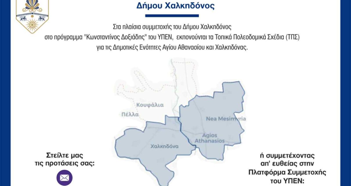 Δ. Χαλκηδόνος: κάλεσμα σε δημότες & φορείς στις 9/9/25 για τη συμμετοχή τους στην παρουσίαση των Εναλλακτικών Σεναρίων της μελέτης ΤΟΠΙΚΟ ΠΟΛΕΟΔΟΜΙΚΟ ΣΧΕΔΙΟ ΔΗΜΟΥ ΧΑΛΚΗΔΟΝΟΣ (Δ.Ε. ΑΓΙΟΥ ΑΘΑΝΑΣΙΟΥ, Δ.Ε. ΧΑΛΚΗΔΟΝΑΣ).