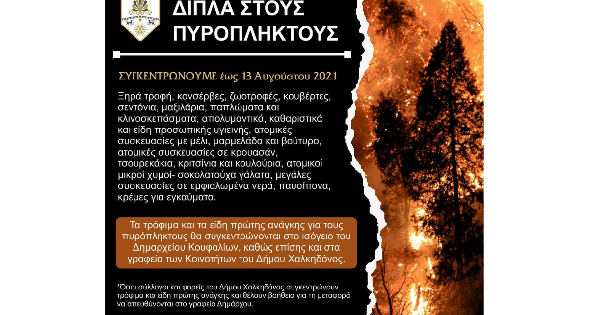 Δήμος Χαλκηδόνος: Συγκέντρωση τροφίμων και ειδών πρώτης ανάγκης για τους πυρόπληκτους