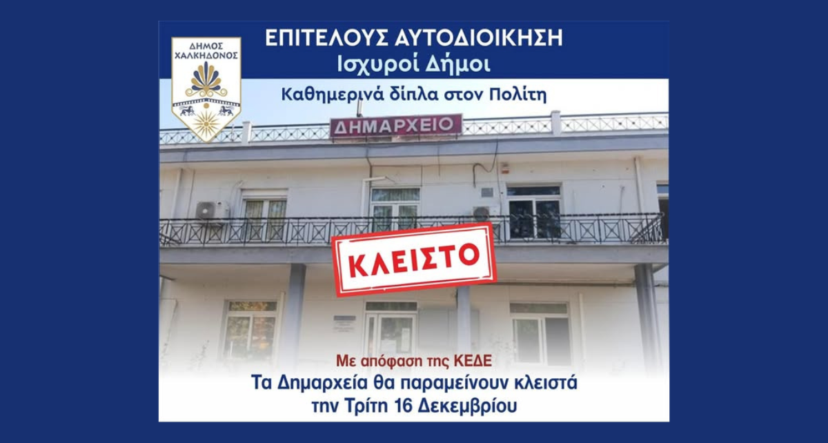 Κλειστός ο Δήμος Χαλκηδόνος την Τρίτη 16 Δεκεμβρίου 2025 λόγω συμμετοχής στην πανελλαδική κινητοποίηση της ΚΕΔΕ Ο Δήμος Χαλκηδόνος, εφαρμόζοντας την ομόφωνη απόφαση της Κεντρικής Ένωσης Δήμων Ελλάδας (ΚΕΔΕ) και της ΠΕΔ Κεντρικής Μακεδονίας, θα προβεί την Τρίτη 16 Δεκεμβρίου σε συμβολικό κλείσιμο των υπηρεσιών του Δήμου, κατόπιν απόφασης του Δημάρχου, Σταύρου Αναγνωστόπουλου.Ο Δήμος Χαλκηδόνος […]