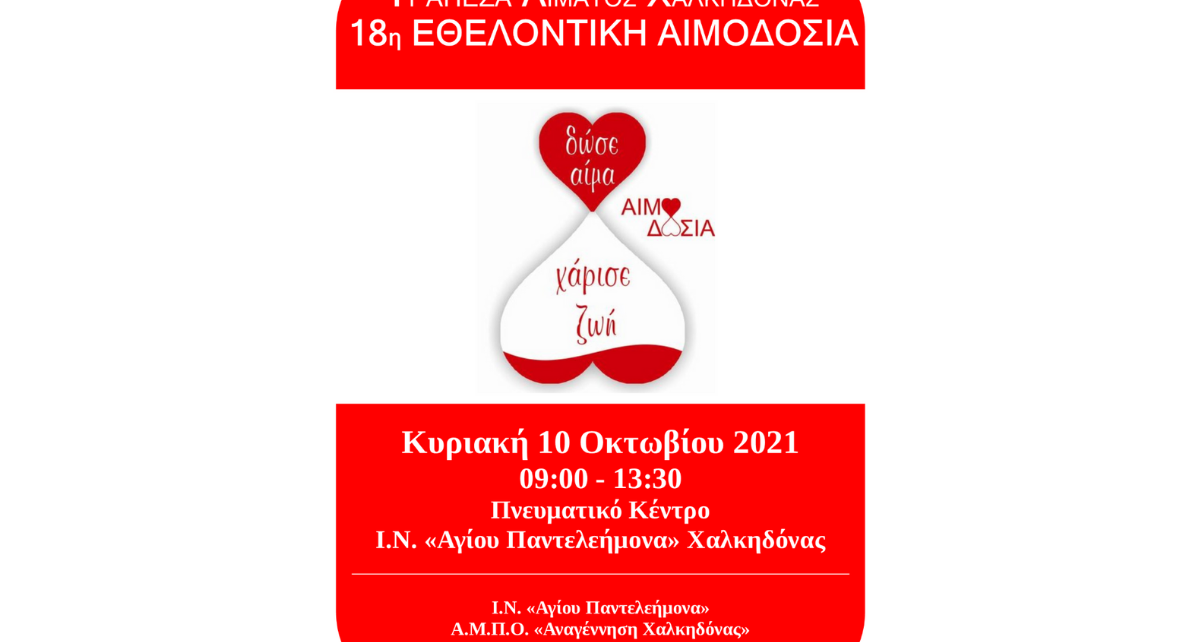 18η εθελοντική αιμοδοσία, Τράπεζα αίματος Χαλκηδόνος Ο Δήμος Χαλκηδόνος σε συνεργασία με τον Ι.Ν. “Αγίου Παντελεήμονα“, την Α.Μ.Π.Ο. “Αναγέννηση Χαλκηδόνος” και τον Μορφωτικό και Πολιτιστικό Σύλλογο Χαλκηδόνος διοργανώνει εθελοντική αιμοδοσία την Κυριακή 10 Οκτωβρίου 2021 και ώρα 09.00-13.30 στο Πνευματικό Κέντρο του Ι.Ν. “Αγίου Παντελεήμονα Χαλκηδόνος” “Δώσε αίμα – Χάρισε ζωή“