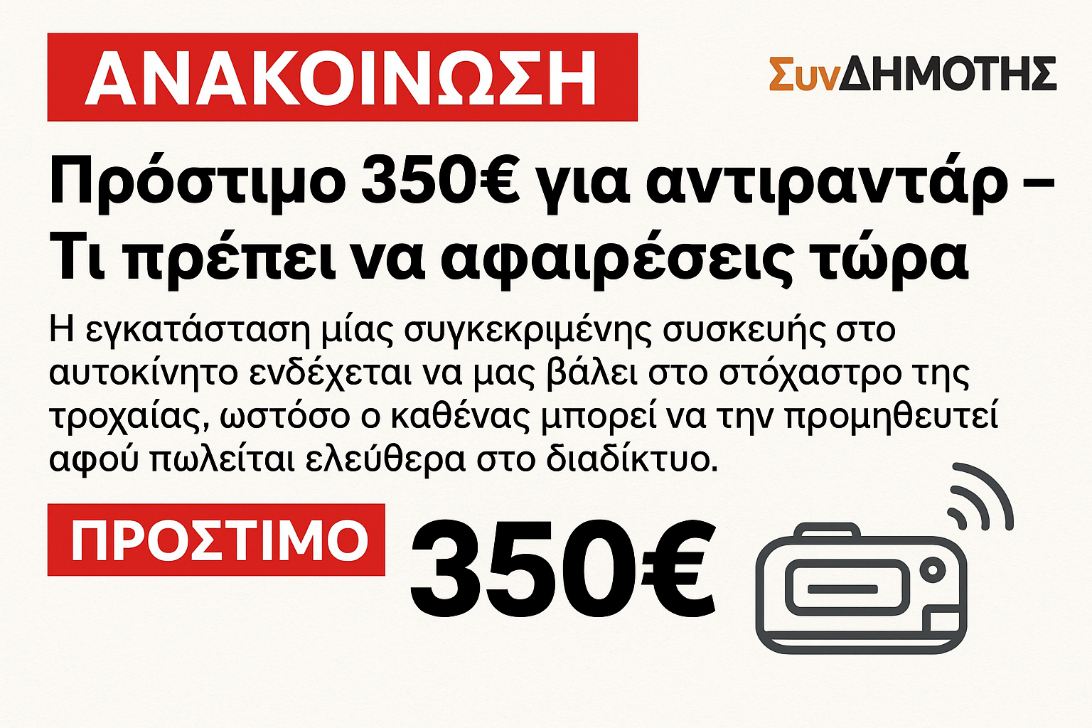 🚗 Πρόστιμο 350 ευρώ και αφαίρεση διπλώματος Ποια συσκευή πρέπει να βγάλεις άμεσα από το αυτοκίνητό σου Η χρήση ορισμένων συσκευών στο αυτοκίνητο μπορεί να οδηγήσει σε τσουχτερό πρόστιμο, ακόμα και σε αφαίρεση διπλώματος και πινακίδων για έναν ολόκληρο μήνα. Πρόκειται για τα γνωστά αντιραντάρ, τις συσκευές που εντοπίζουν κάμερες και ραντάρ ταχύτητας στους δρόμους, […]
