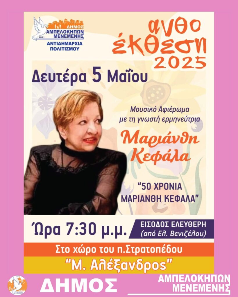 Ο Δήμος Αμπελοκήπων-Μενεμένης σας προσκαλεί ΣΗΜΕΡΑ σε ένα ξεχωριστό μουσικό αφιέρωμα με τίτλο “50 Χρόνια Μαριάνθη Κεφάλα”.