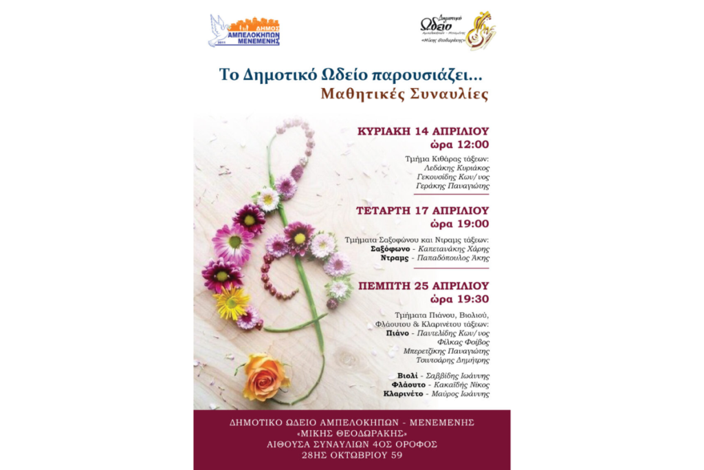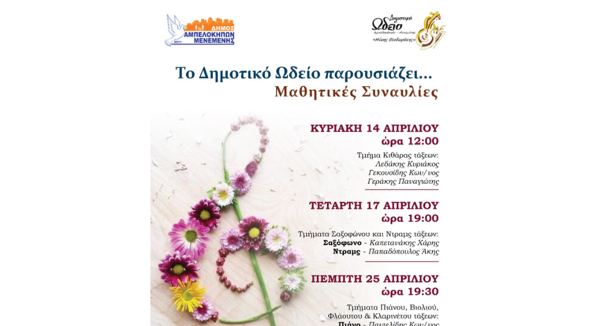 Ο Δήμος Αμπελοκήπων-Μενεμένης και η Αντιδημαρχία Πολιτισμού σας προσκαλούν στις Μαθητικές Συναυλίες του Δημοτικού Ωδείου Αμπελοκήπων “Μίκης Θεοδωράκης”.