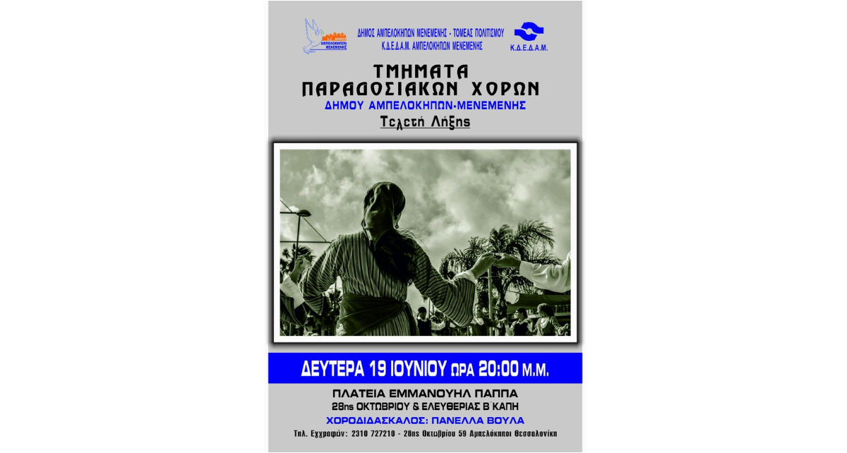 Ο Δήμος Αμπελοκήπων-Μενεμένης, ο Τομέας Πολιτισμού και η Κοινωφελής Δημοτική Επιχείρηση σας προσκαλούν στην τελετή λήξης των τμημάτων παραδοσιακών χορών με χοροδιδάσκαλο την κ. Βούλα Πανέλα τη Δευτέρα 19/6 στις 8μ.μ. στην Πλατεία Εμμανουήλ Παππά (28ης Οκτωβρίου-Ελευθερίας, Αμπελόκηποι).