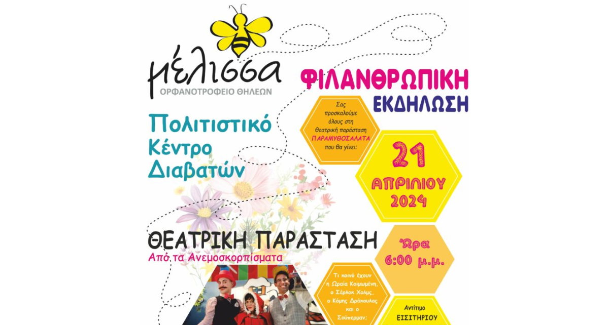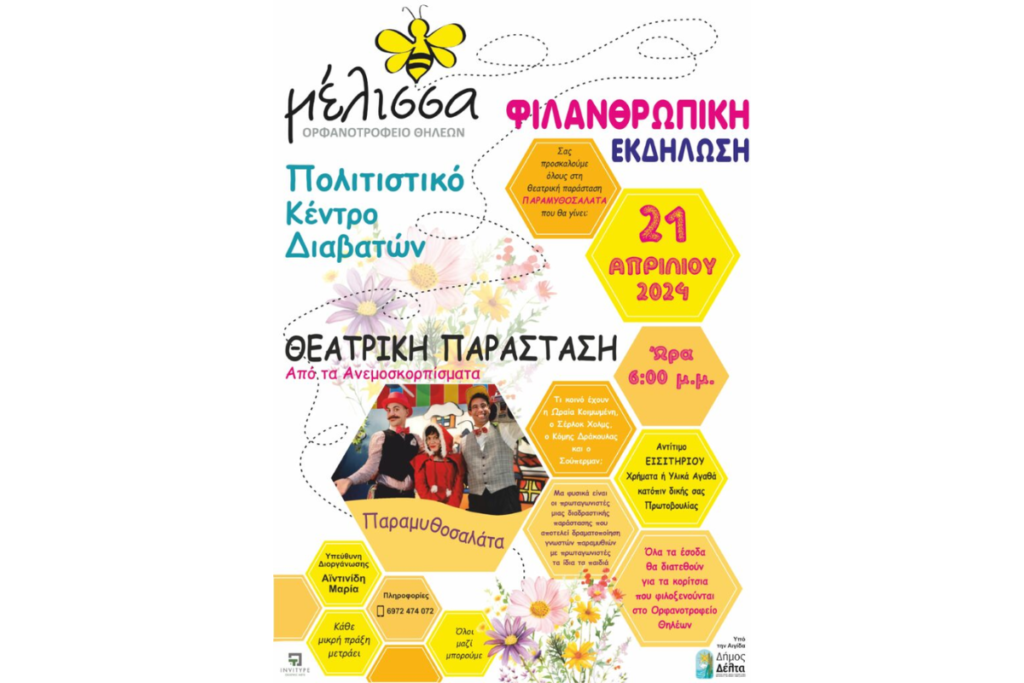 Ο Δήμος Δέλτα καλεί όλους τους δημότες και τις δημότισσες να σταθούν ενεργά δίπλα στα κορίτσια που υποστήριζει ο φορέας Παιδικής Προστασίας «Η Μέλισσα» και να τιμήσουν με την παρουσία τους τη φιλανθρωπική εκδήλωση, που θα πραγματοποιηθεί την Κυριακή 21 Απριλίου, στις 18:00, στο Πολιτιστικό Κέντρο Διαβατών υπό την αιγίδα του Δήμου.