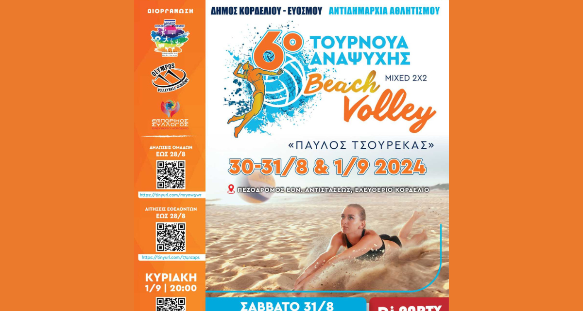 Άνοιξαν οι εγγραφές για το 6ο Τουρνουά Αναψυχής Beach Volley Mixed 2×2 «ΠΑΥΛΟΣ ΤΣΟΥΡΕΚΑΣ», το οποίο διοργανώνει ο Δήμος Κορδελιού – Ευόσμου από τις 30 Αυγούστου έως και την 1η Σεπτεμβρίου 2024 στο αμφιθέατρο του Πεζοδρόμου Ελευθερίου – Κορδελιού.