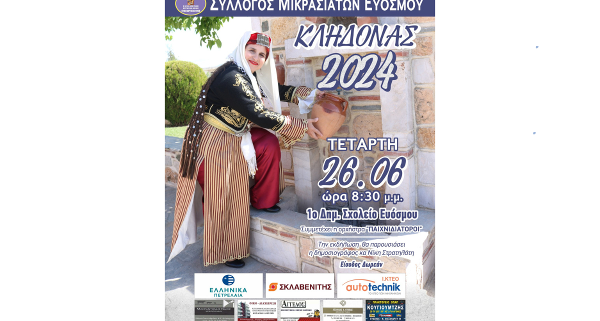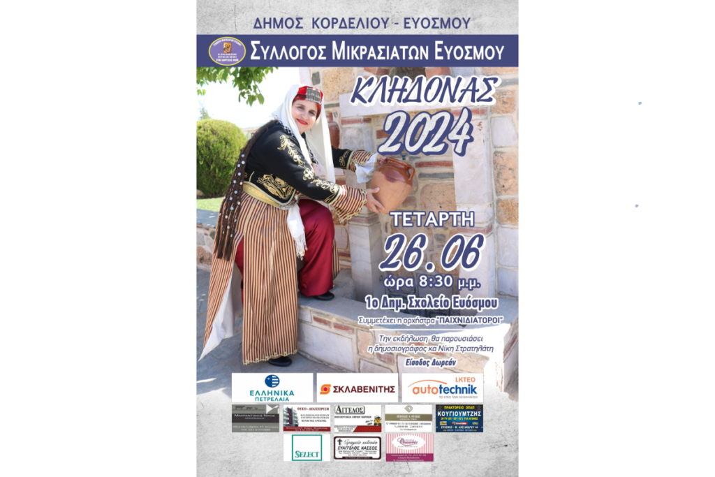 θα αναβιώσουν και φέτος το παραδοσιακό Μικρασιάτικο έθιμο του «ΚΛΗΔΟΝΑ» και σας προσκαλούν την Τετάρτη 26 Ιουλίου 2024 στις 8.30μμ στον αύλειο χώρο του 1ου Δημοτικού Σχολείου Ευόσμου.