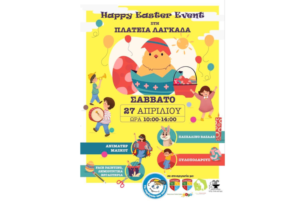 Ο Δήμος Λαγκαδά υποδέχεται και στηρίζει το “Χαμόγελο του Παιδιού”, που σε συνεργασία με τον Παιδικό Σταθμό “Ονειροχώρα” όπου διοργανώνουν Εκδήλωση “Happy Easter Event”. Η εκδήλωση θα περιέχει ένα Πασχαλινό Bazaar για τους μικρούς μας φίλους, Ανιματέρ Μασκότ, Ξυλοπόδαρους, Δημιουργικά εργαστήρια και Face-Painting (Ζωγραφική προσώπου).
