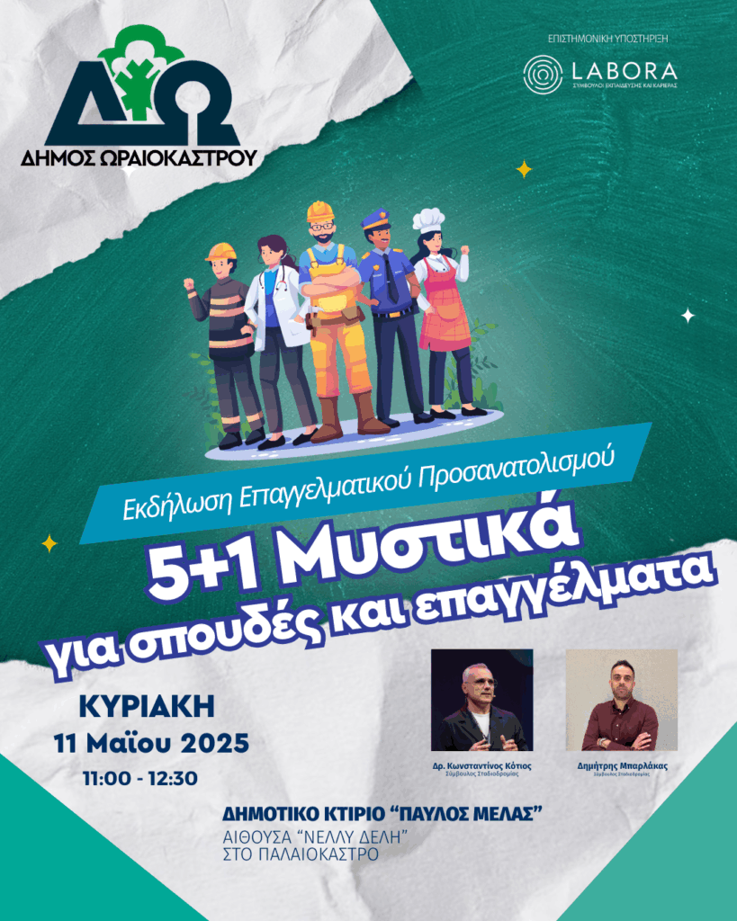 Ο Δήμος Ωραιοκάστρου, σε συνεργασία με τη Labora, υλοποιούν για πρώτη φορά πρόγραμμα δωρεάν υπηρεσιών διεξαγωγής σεμιναρίων για τα επαγγέλματα με μέλλον και επιλογή σπουδών για τους μαθητές της Γ΄ Τάξης των Λυκείων του Δήμου Ωραιοκάστρου.