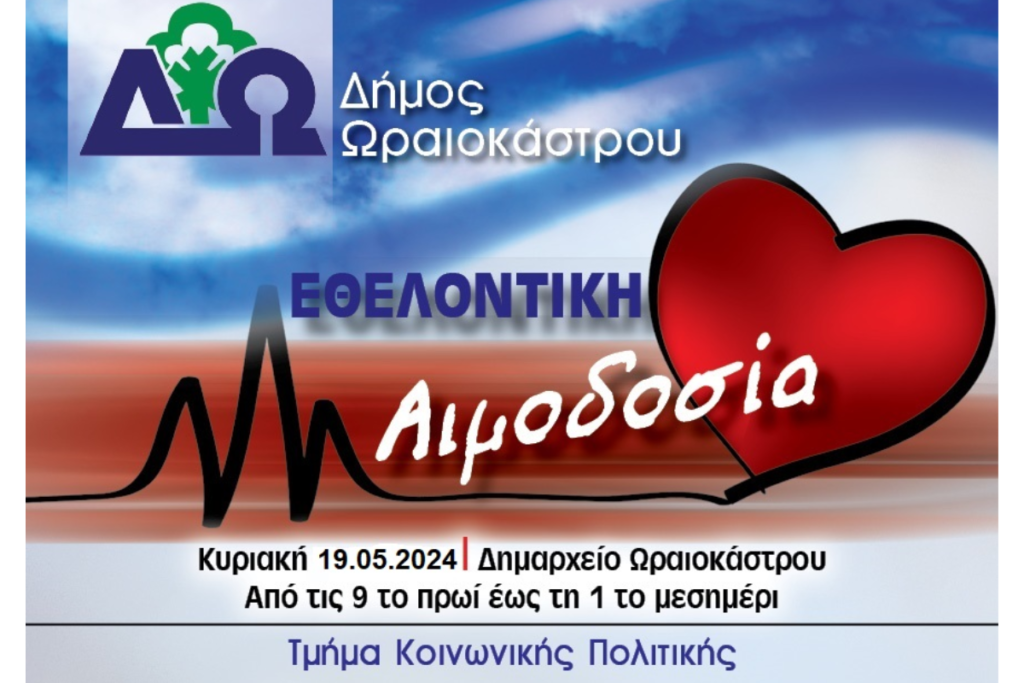 Δ. Ωραιοκάστρου: Εθελοντική αιμοδοσία και ενημέρωση-εγγραφή εθελοντών δοτών μυελού των οστών στις 19 Μαΐου 2024