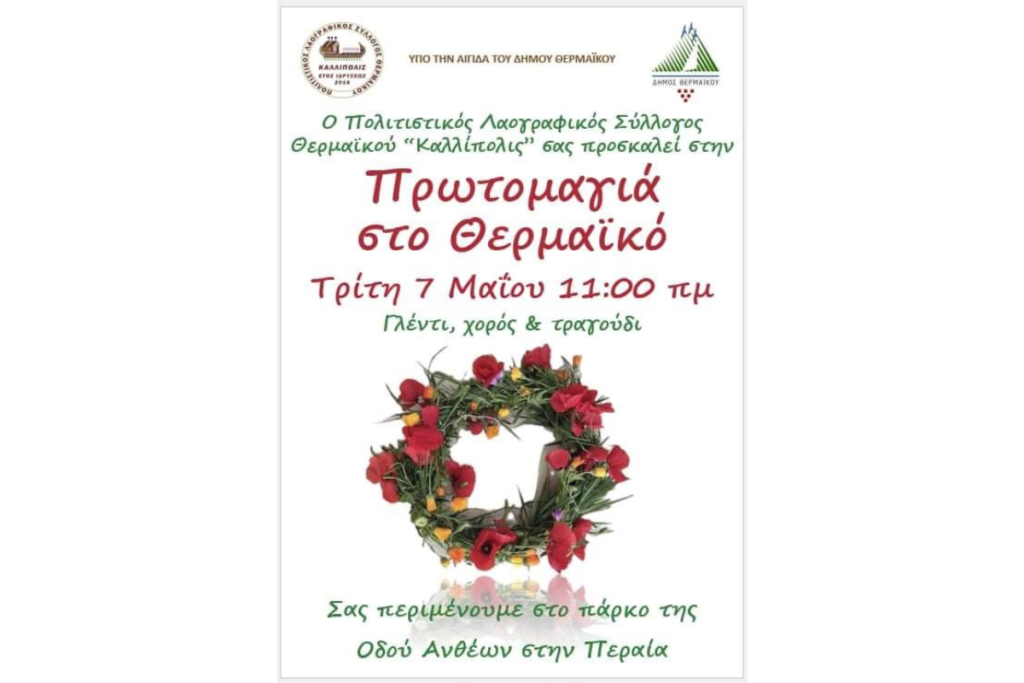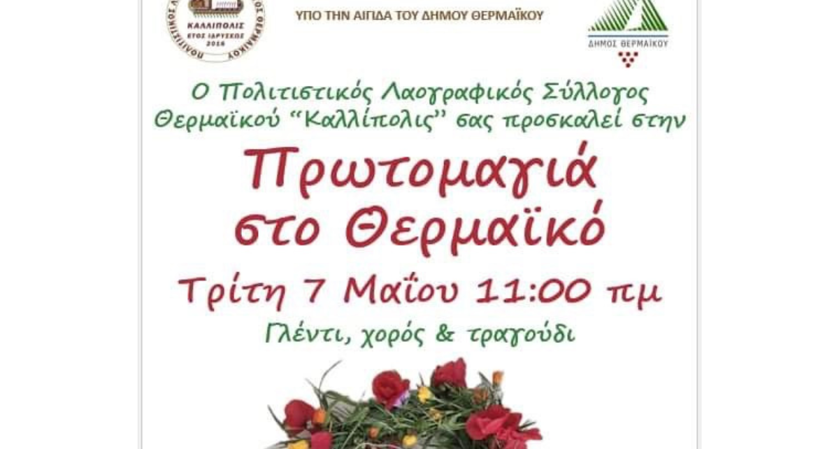 Ο Πολιτιστικός Λαογραφικός Σύλλογος Θερμαϊκού ”Καλλίπολις”, διοργανώνει και φέτος, την εκδήλωση «Πρωτομαγιά στον Θερμαϊκό».
