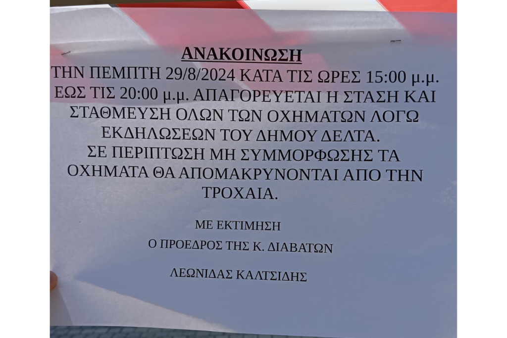 “Την Πέμπτη 29 Αυγούστου 2024 κατά τις ώρες 15:00 έως 20:00 μ.μ στον δρόμο της Ελευθερίου Βενιζέλου απαγορεύεται η στάση και η στάθμευση όλων των οχημάτων λόγω της εκδήλωσης του Δήμου Δέλτα. Έχει ειδοποιηθεί η τροχαία Χαλκηδόνας και θα βρίσκεται εκεί.