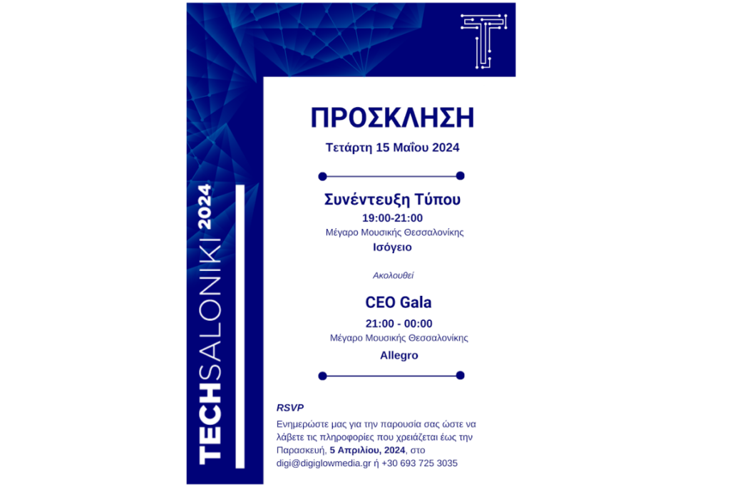 Η Digiglow Media με χαρά σας προσκαλεί στο Press Conference του TechSaloniki2024, που θα λάβει χώρα στις 15 Μαΐου 2024 στο ΜΕΓΑΡΟ ΜΟΥΣΙΚΗΣ ΘΕΣΣΑΛΟΝΙΚΗΣ – ΚΤΙΡΙΟ Μ2 (Ισόγειο) και ώρα 19:00-21:00.