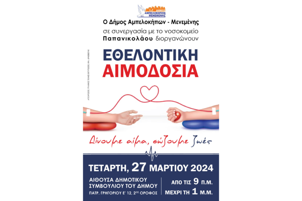 Ο Δήμος Αμπελοκήπων-Μενεμένης σε συνεργασία με το Νοσοκομείο “Παπανικολάου” διοργανώνουν εθελοντική αιμοδοσία την Τετάρτη 27/3 από τις 9πμ έως τη 1μμ στην Αίθουσα Δημοτικού Συμβουλίου του Δήμου (Πατρ. Γρηγορίου Ε’ 12, 2ος όροφος). Δίνουμε αίμα σώζουμε ζωές.