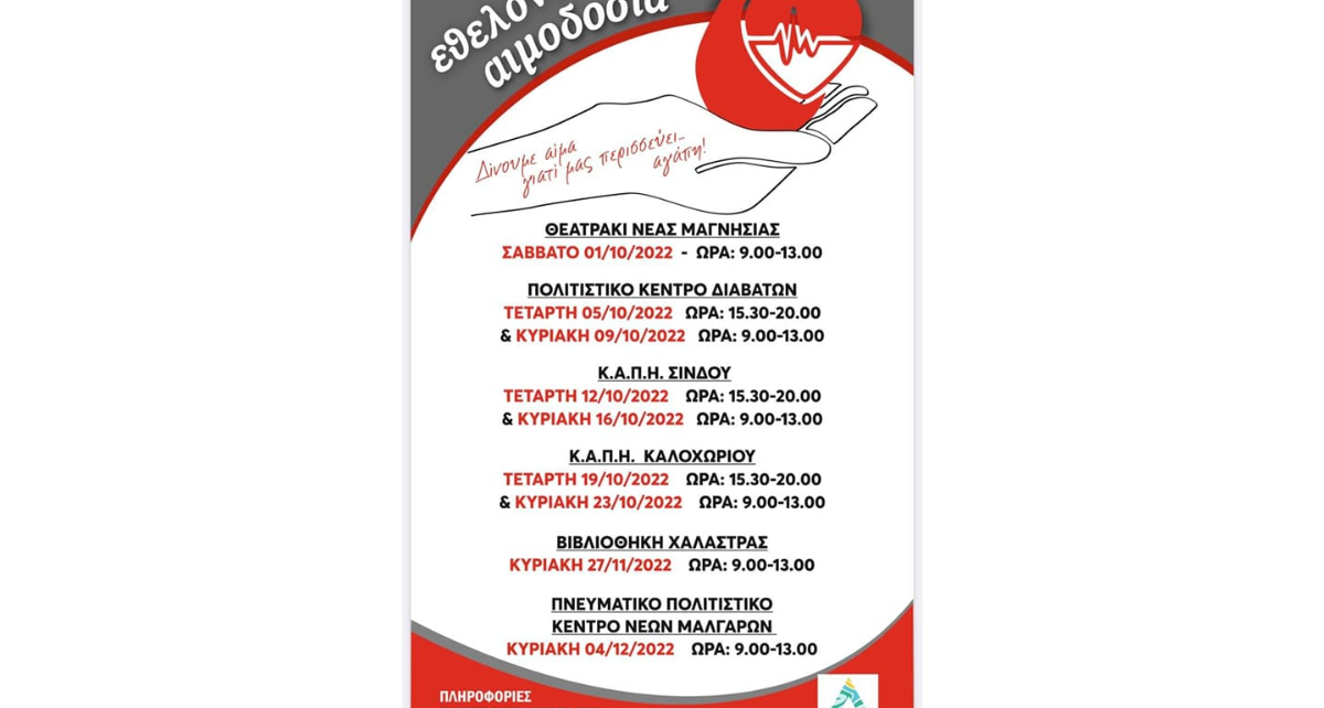Ο Κοινωνικός Πολιτιστικός Οργανισμός Δήμου Δέλτα (Κ.Π.Ο.Δ.Δ.) διοργανώνει Εθελοντική Αιμοδοσία, αναλυτικά το πρόγραμμα: