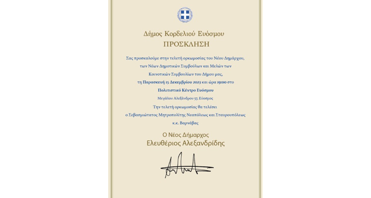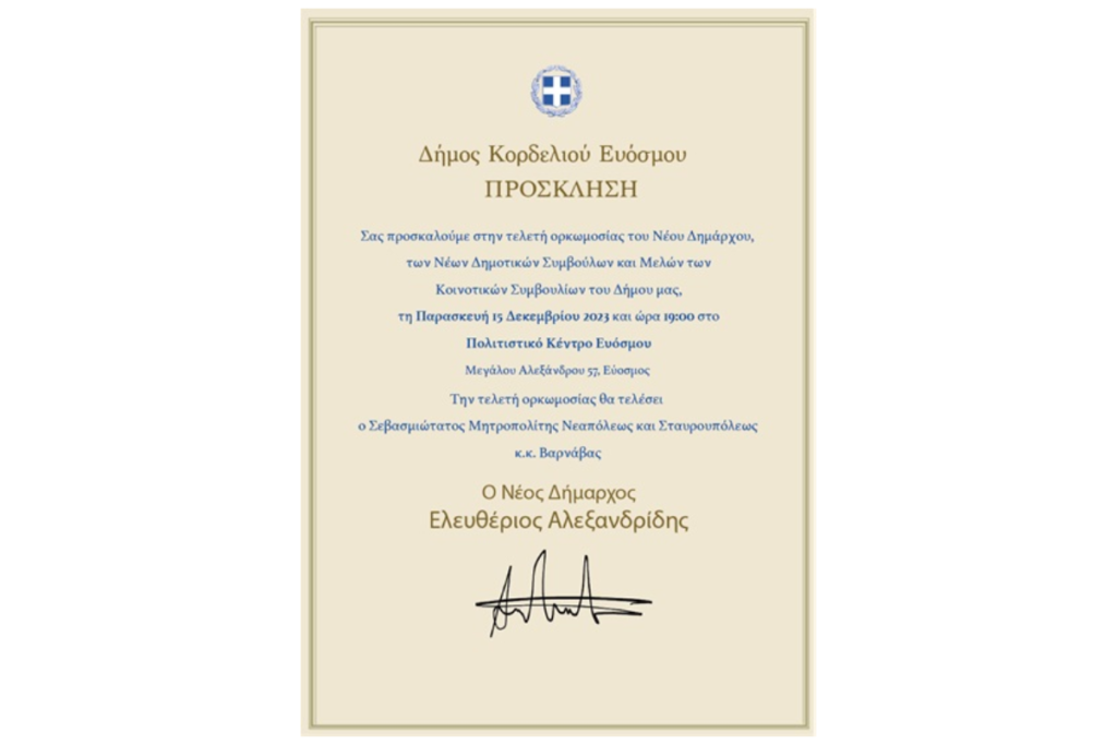 -Νέου Δημάρχου Κορδελιού Ευόσμου κ. Ελευθέριου Αλεξανδρίδη,