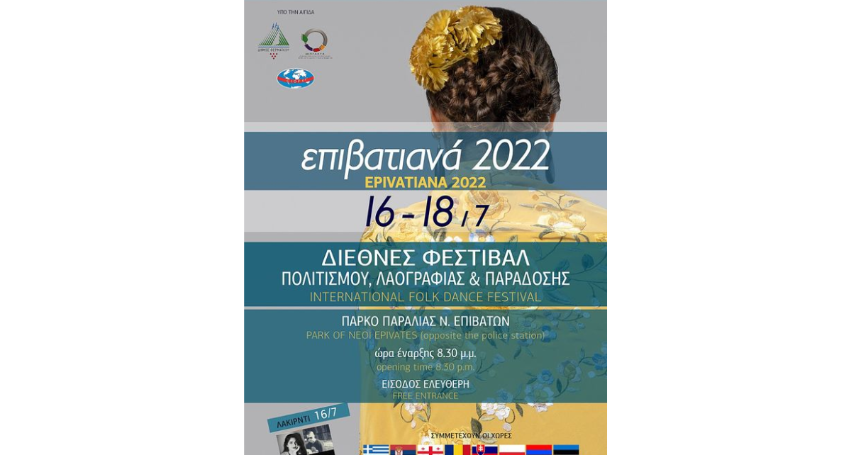 Ο Πολιτιστικός Σύλλογος “ΝΕΟΙ ΕΠΙΒΑΤΕΣ“, μετά από δυο χρόνια αναστολής εκδηλώσεων λόγω της πανδημίας covid-19, διοργανώνει το Διεθνές Φεστιβάλ Πολιτισμού, Λαογραφίας & Παράδοσης «ΕΠΙΒΑΤΙΑΝΑ 2022», από το Σάββατο 16 Ιουλίου έως και τη Δευτέρα 18 Ιουλίου 2022, στο πάρκο παραλίας Ν. Επιβατών (απέναντι από το Αστυνομικό Τμήμα).