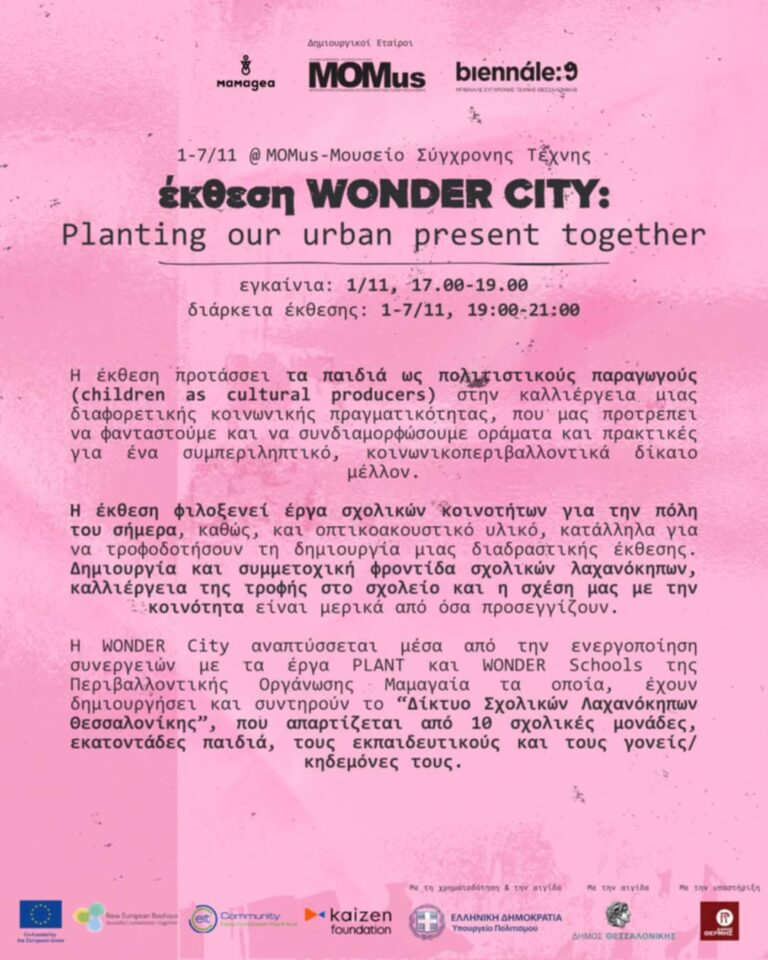 Τα εγκαίνια της έκθεσης “WONDER CITY” της Μαμαγαία θα πραγματοποιηθούν στο Μουσείο Σύγχρονης Τέχνης (ΔΕΘ, 1ος όροφος) το Σάββατο 1 Νοεμβρίου, 17:00 – 19:00, και η έκθεση θα διαρκέσει έως την Παρασκευή 07/11. Μαθητές, γονείς και δάσκαλοι των συνεργαζόμενων σχολικών τμημάτων καλούνται να συμμετάσχουν, να μοιραστούν εμπειρίες και να δουν από κοντά τα αποτελέσματα της συμμετοχής τους.
