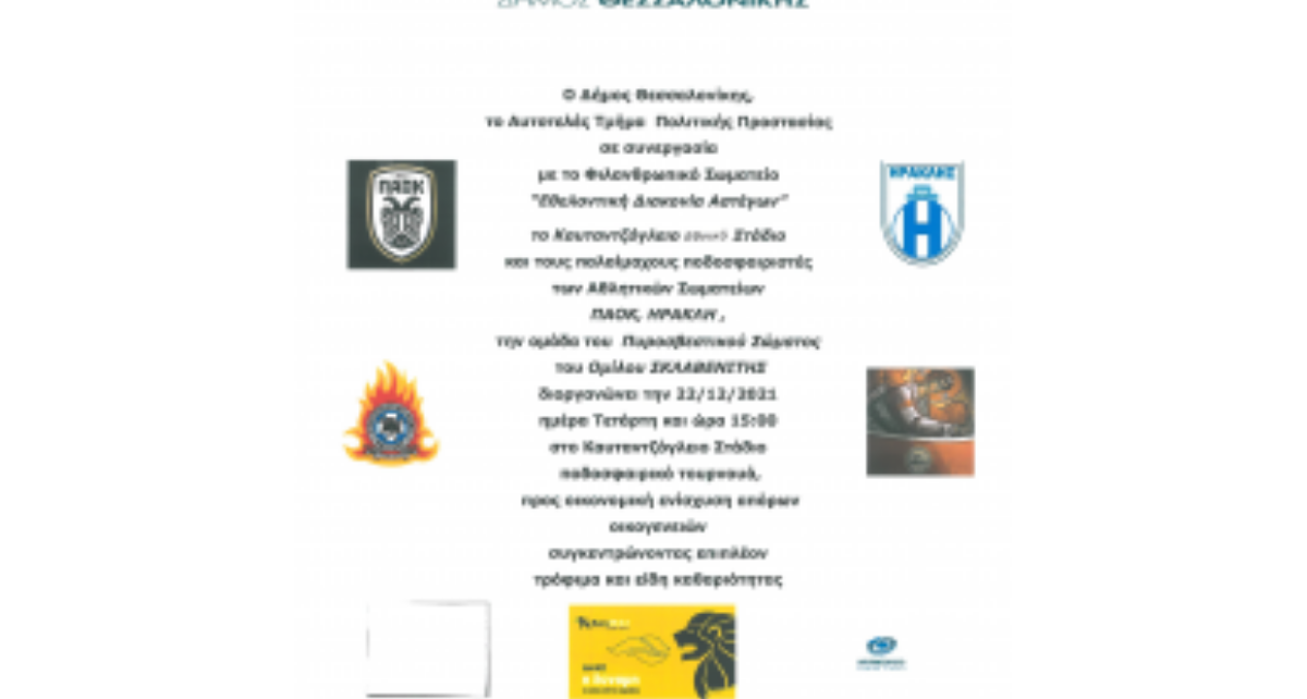 Το Αυτοτελές Τμήμα Πολιτικής Προστασίας, σας ενημερώνει για την διεξαγωγή ποδοσφαιρικού «Τουρνουά Αγάπης» την Τετάρτη 22 Δεκεμβρίου 2021 και ώρα 15:00 στο Καυταντζόγλειο Στάδιο, προς οικονομική ενίσχυση απόρων οικογενειών, σε συνεργασία με το φιλανθρωπικό σωματείο “Εθελοντική Διακονία Αστέγων”, το Καυταντζόγλειο Εθνικό Στάδιο τους παλαίμαχους ποδοσφαιριστές των αθλητικών σωματείων ΠΑΟΚ, ΗΡΑΚΛΗ, την ομάδα του Πυροσβεστικού Σώματος, του Ομίλου ΣΚΛΑΒΕΝΙΤΗΣ και της ΕΔΑΘΕΣΣ.