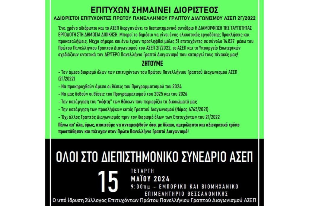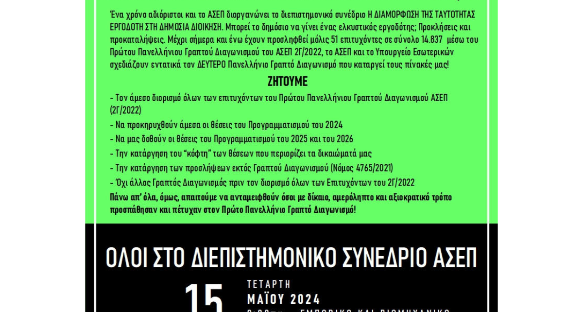 Με αφορμή το 3ο Διεπιστημονικό Συνέδριο του ΑΣΕΠ, με τίτλο: “Η διαμορφωση της ταυτότητας εργοδότη στη Δημόσια Διοίκηση. Μπορεί το δημόσιο να γίνει ένας ελκυστικός εργοδότης; Προκλήσεις και προκαταλήψεις.” που γίνεται την Τετάρτη 15 Μαΐου 2024 στις 9:00 πμ στο Εμπορικό και Βιομηχανικό Επιμελητήριο Θεσσαλονίκης, θα θέλαμε να σας ενημερώσουμε πως θα δώσουμε το παρών ως Επιτυχόντες του Πρώτου Πανελλήνιου Γραπτού Διαγωνισμού 2Γ/2022 για να γνωστοποιήσουμε στο κοινό για το θέμα του διορισμού μας και για τα προβλήματα που μας απασχολούν.