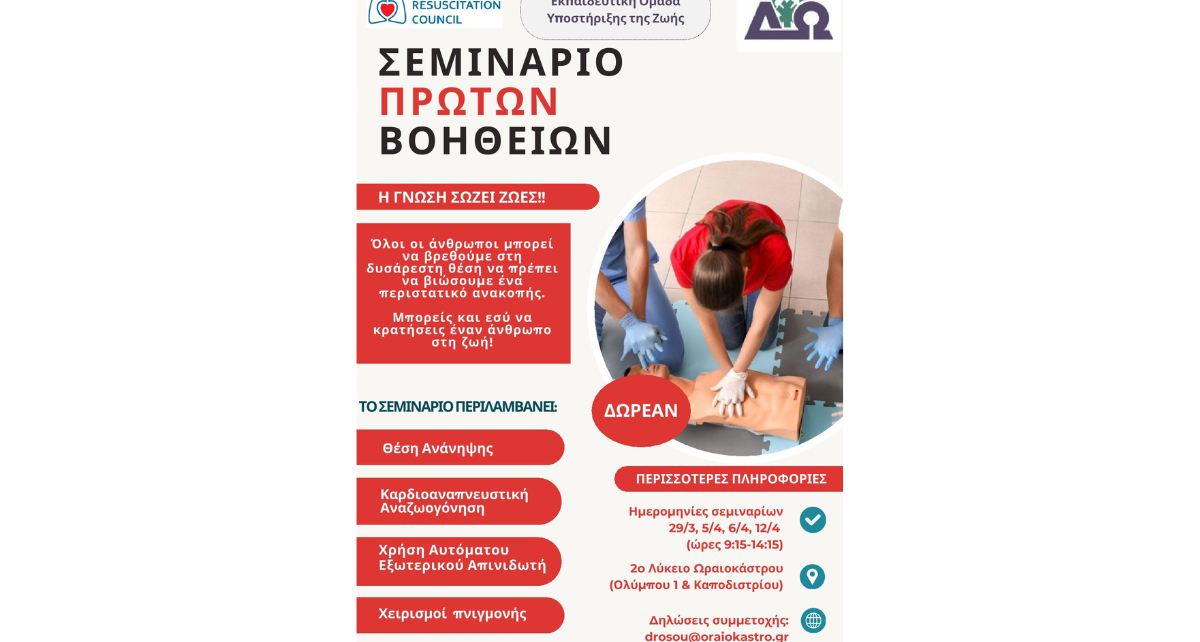 Δωρεάν σεμινάρια ΚΑΡΠΑ – Καρδιοπνευμονικής Αναζωογόνησης – για ενήλικες θα πραγματοποιηθούν στο Δήμο Ωραιοκάστρου.