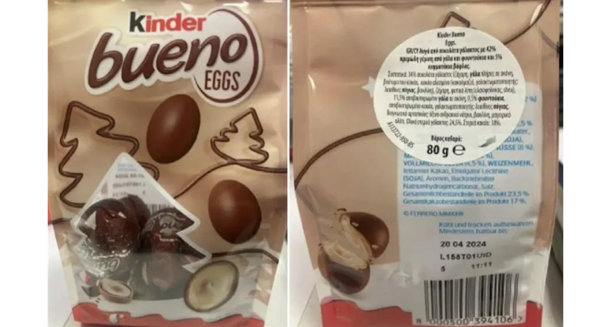 Σε ανάκληση του τροφίμου «Kinder Bueno Eggs» των 80 γραμμαρίων προχωρά ο ΕΦΕΤ, καθώς διαπιστώθηκε η μη αναγραφή στην ελληνική γλώσσα του συστατικού «αλεύρι σίτου», το οποίο είναι αλλεργιογόνο καθώς περιέχει γλουτένη.