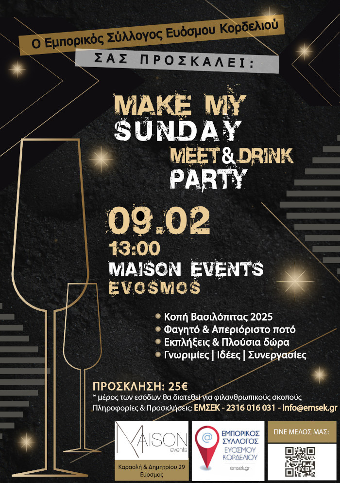 Σας προσκαλούμε στις 9 Φεβρουαρίου στις 13:00 στο Maison Events (Καραολή & Δημητρίου 29) για φαγητό, ποτό και συζήτηση.