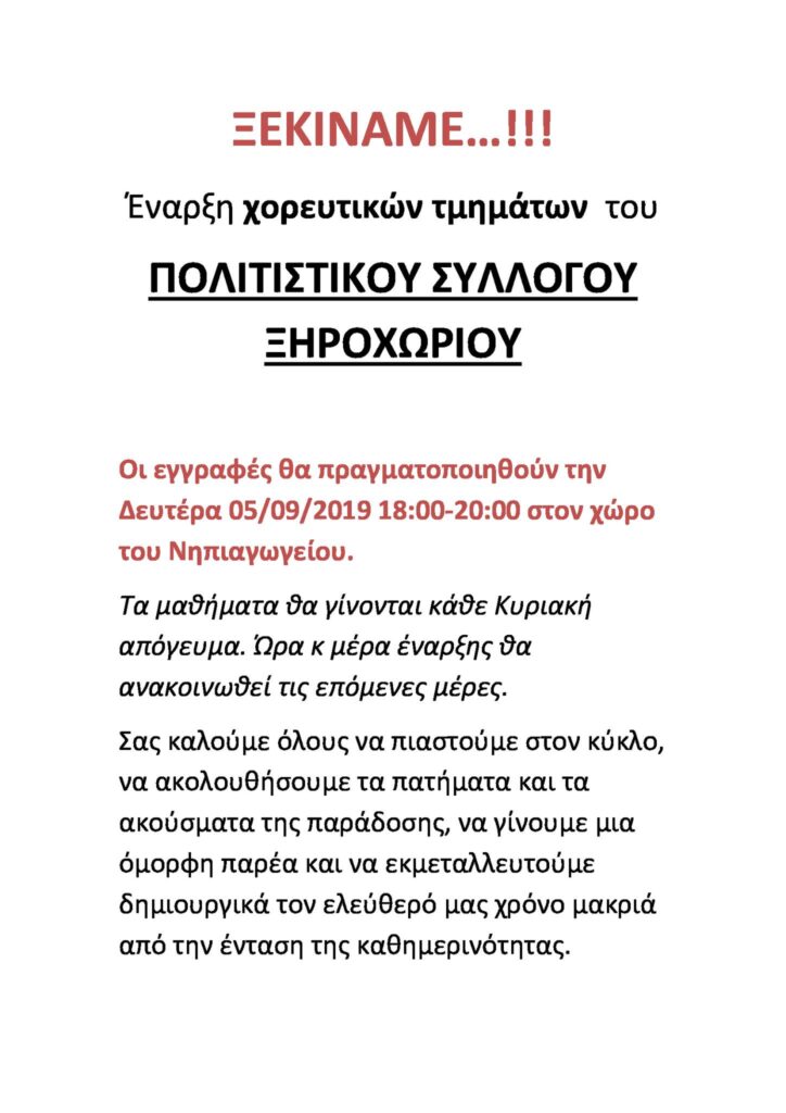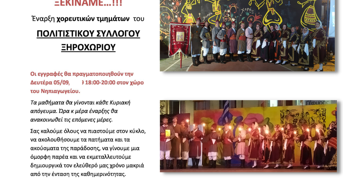 Ο Πολιτιστικός Σύλλογος Ξηροχωρίου ξεκινάει τα μαθήματα των χορευτικών τμημάτων.