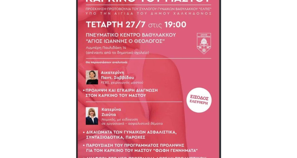 Ο Σύλλογος Γυναικών Βαθυλάκκου “Ελπις” διοργανώνει ενημερωτική εκδήλωση για τον “Καρκίνο του Μαστού” την Τετάρτη 27 Ιουλίου 2022, στις 19:00 στο πνευματικό κέντρο Βαθυλάκκου “Άγιος Ιωάννης Θεολόγος”, Λυμπέρη Παυλίδη 14 (απέναντι από το δημοτικό σχολείο).