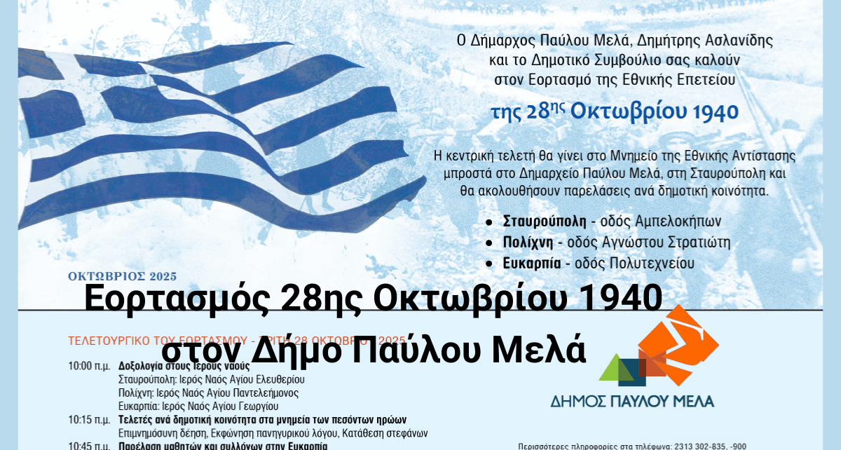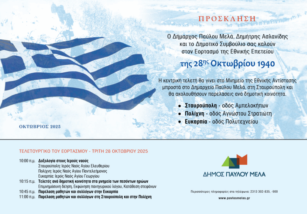 Ο Δήμαρχος Παύλου Μελά, Δημήτρης Ασλανίδης, και το Δημοτικό Συμβούλιο προσκαλούν τους πολίτες να συμμετάσχουν στις επετειακές εκδηλώσεις για την 28η Οκτωβρίου 1940, τιμώντας τους ήρωες του Έπους του ’40 και της Εθνικής Αντίστασης.