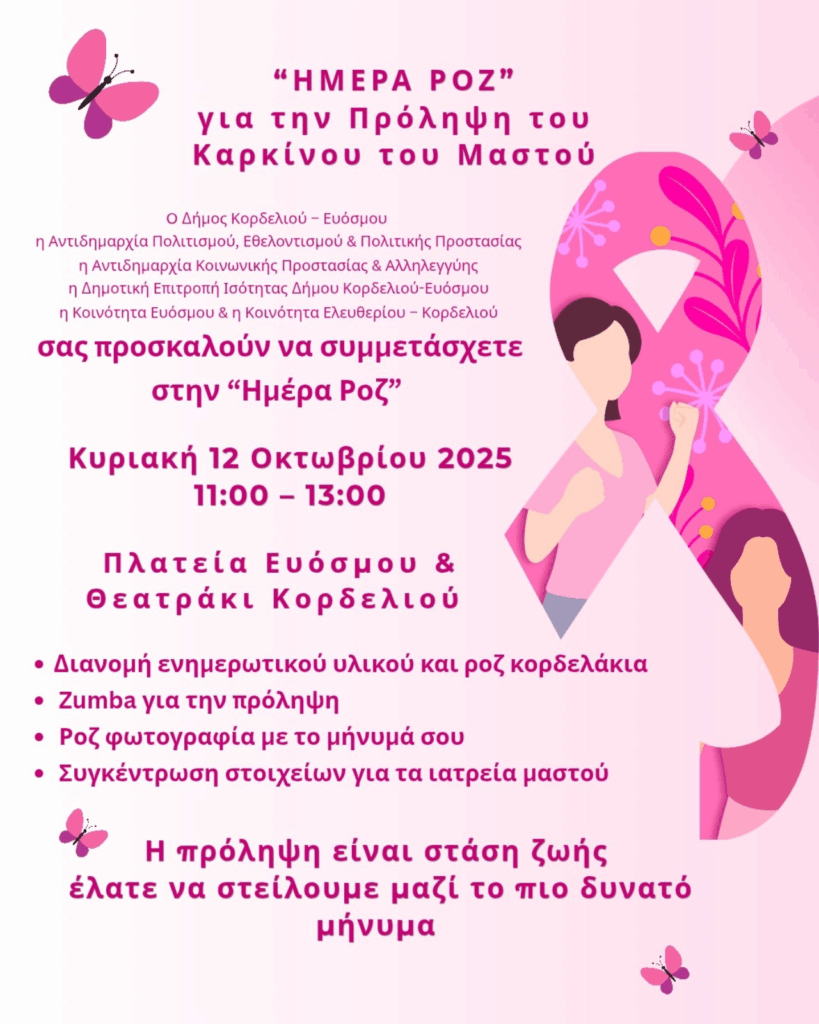 Οι εκδηλώσεις, με τίτλο «Ημέρα Ροζ», θα πραγματοποιηθούν την Κυριακή 12 Οκτωβρίου, από τις 11:00 π.μ. έως τις 13:00 μ.μ., στην κεντρική πλατεία Ευόσμου και στο θεατράκι του Ελευθερίου – Κορδελιού.