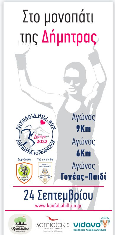 Ο Δήμος Χαλκηδόνας, ο Όμιλος Αντισφαίρισης Κουφαλίων και η οργανωτική επιτροπήτου Koufalia HillRun Δήμητρα Ιορδανίδου, με την υποστήριξη τοπικών και αθλητικών φορέων, προκηρύσσουν το Σάββατο 24 Σεπτεμβρίου 2022 τους παρακάτω αγώνες δρόμου και εκδηλώσεις: