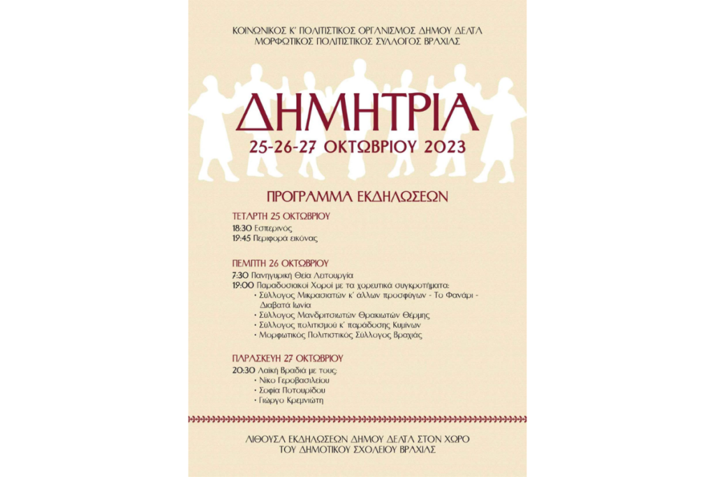 σας προσκαλούν να παρευρεθείτε σε διήμερες εορταστικές εκδηλώσεις για τα «ΔΗΜΗΤΡΙΑ 2023» με παραδοσιακά και λαϊκά σχήματα στην αίθουσα πολλαπλών χρήσεων του Δημοτικού Σχολείου Βραχιάς στις 25, 26 και 27 Οκτωβρίου.