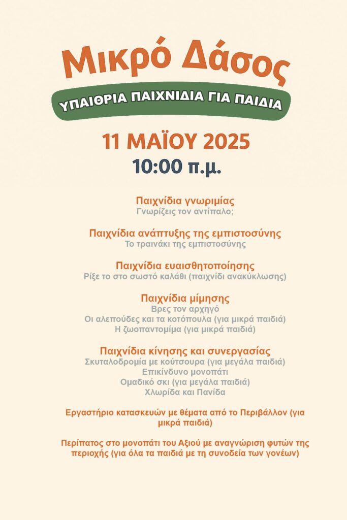 Στο πλαίσιο της εκδήλωσης θα πραγματοποιηθούν παιχνίδια και εργαστήρια κατασκευών για παιδιά όλων των ηλικιών. Τα μικρότερα παιδιά θα έχουν τη δυνατότητα να συμμετάσχουν σε εργαστήρια χειροτεχνίας με θέματα από τη φύση, ενώ τα μεγαλύτερα παιδιά θα πάρουν μέρος σε δραστηριότητες που θα υλοποιήσει ο καθηγητής φυσικής αγωγής και συγγραφέας του βιβλίου «Υπαίθριες δραστηριότητες και περιβαλλοντικά παιχνίδια», Γιώργος Κεχλιμπάρης, με τη συνεργασία του 1ου Συστήματος Προσκόπων Πολυκάστρου.