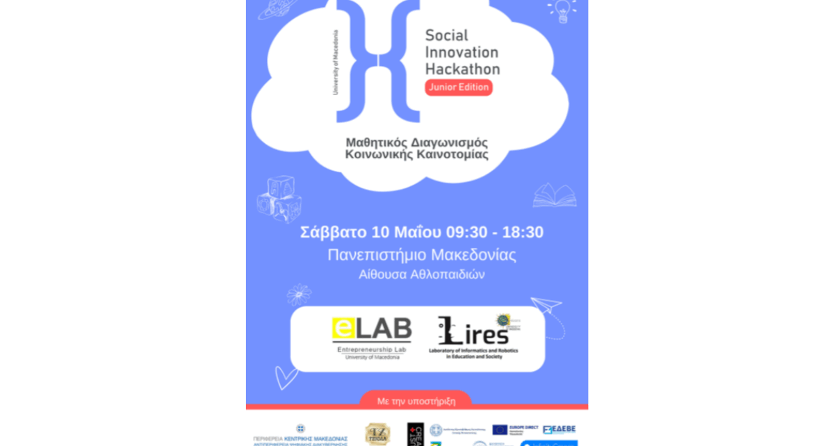 Με την υποστήριξη της Περιφέρειας Κεντρικής Μακεδονίας και της Αντιπεριφέρειας Ψηφιακής Διακυβέρνησης πραγματοποιείται το Σάββατο 10 Μαΐου, στο Πανεπιστήμιο Μακεδονίας, ο μαθητικός διαγωνισμός «Social Innovation Hackathon: Junior Edition». Στο πλαίσιο της διοργάνωσης, μαθητές και μαθήτριες της Πρωτοβάθμιας και Δευτεροβάθμιας Εκπαίδευσης της Δυτικής Θεσσαλονίκης θα κληθούν να αναπτύξουν καινοτόμες επιχειρηματικές ιδέες για την αντιμετώπιση κοινωνικών προβλημάτων.