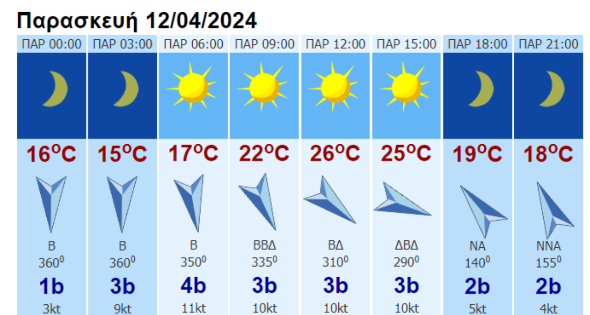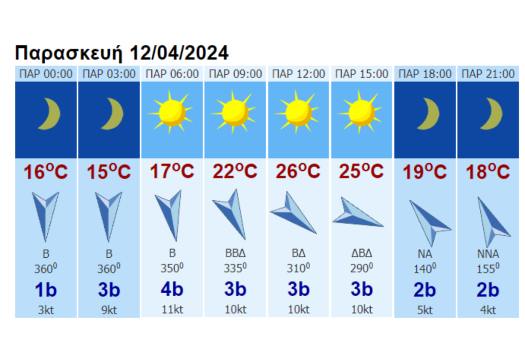 Ανεμοι: Βόρειοι 3 με 5 και στα ανατολικά βορειοανατολικοί 5 με 6 μποφόρ με εξασθένηση από το απόγευμα.