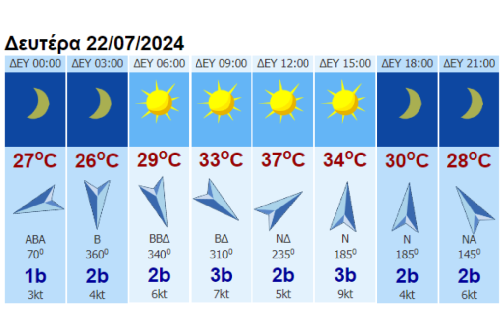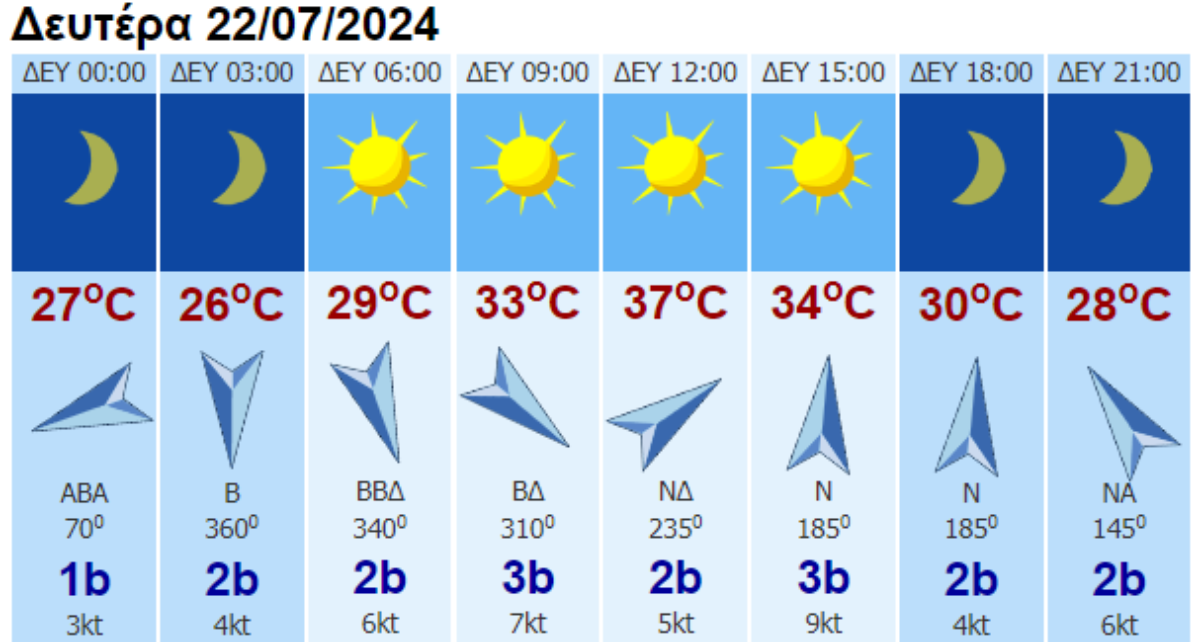 Θερμοκρασία: Από 22 έως 38 με 39 βαθμούς Κελσίου. Στη δυτική Μακεδονία θα είναι 2 με 3 βαθμούς χαμηλότερη.