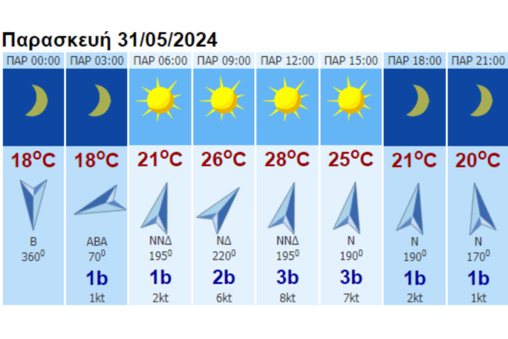Οι άνεμοι θα πνέουν από νότιες διευθύνσεις 3 με 5 και τοπικά στο Αιγαίο 6 μποφόρ.