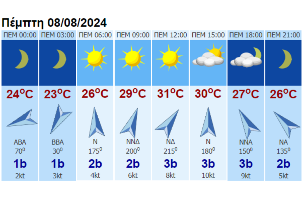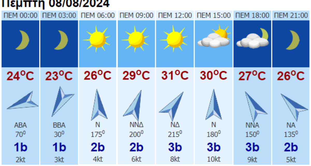 Θερμοκρασία: Από 20 έως 35 και τοπικά τους 36 με 37 βαθμούς Κελσίου.