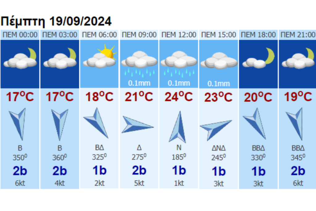 Ανεμοι: Μεταβλητοί 2 με 4 μποφόρ και στη Θράκη βορειοανατολικοί πρόσκαιρα έως 5 μποφόρ.