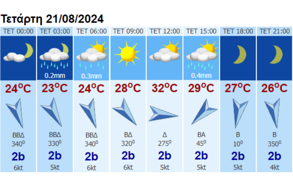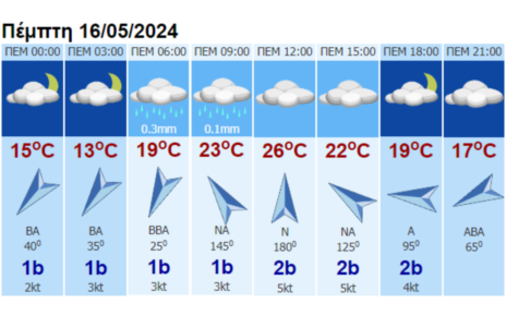 Ανεμοι: Μεταβλητοί 3 με 4 μποφόρ, το βράδυ βορειοδυτικοί με την ίδια ένταση.